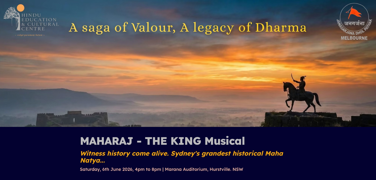 Step back in time and witness history come alive! The Hindu Education & Cultural Centre and Janagarjana Dhol Pathak Melbourne proudly present Sydneyβs grandest historical Maha NatyaβMAHARAJ - THE KING Musical. This isn't just a performance; it is a legacy of Dharma and a tribute to a saga of unparalleled bravery. Experience the breathtaking story of a legendary leader through an immersive musical journey that will leave you inspired! π©π