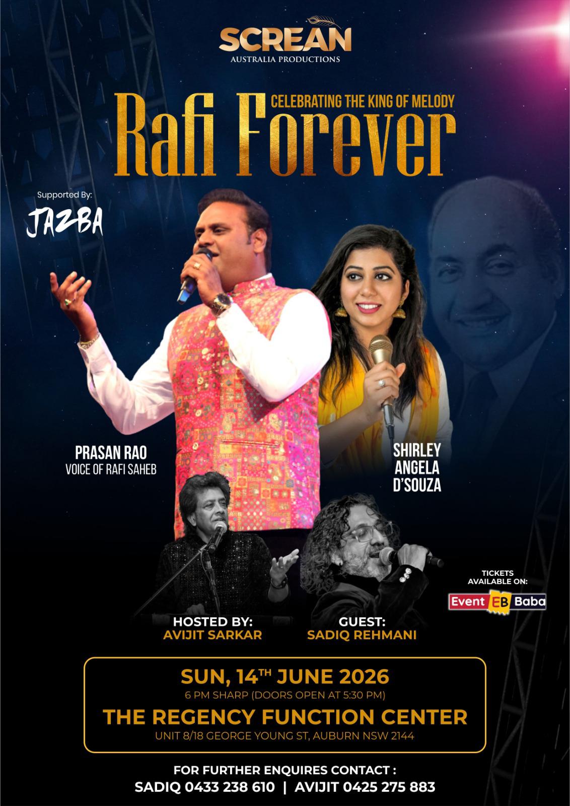 Get ready for an enchanting evening that pays tribute to the legendary voice that defined generations! Screan Australia Productions, supported by Jazba, proudly presents Rafi Forever—a grand musical concert dedicated to the immortal songs of Mohammad Rafi Saheb. 🌟🎤Experience the magic of golden era classics brought to life by incredible performers in a night filled with nostalgia, soul-stirring melodies, and pure musical brilliance.